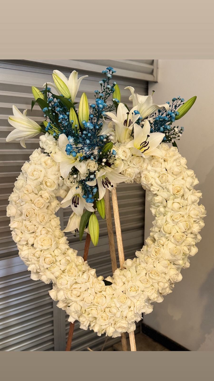 Coroa Fúnebre composta por lindas rosas Colombianas selecionadas, com aplique na lateral composta por lírios, rosas, boca de leão e acabamento